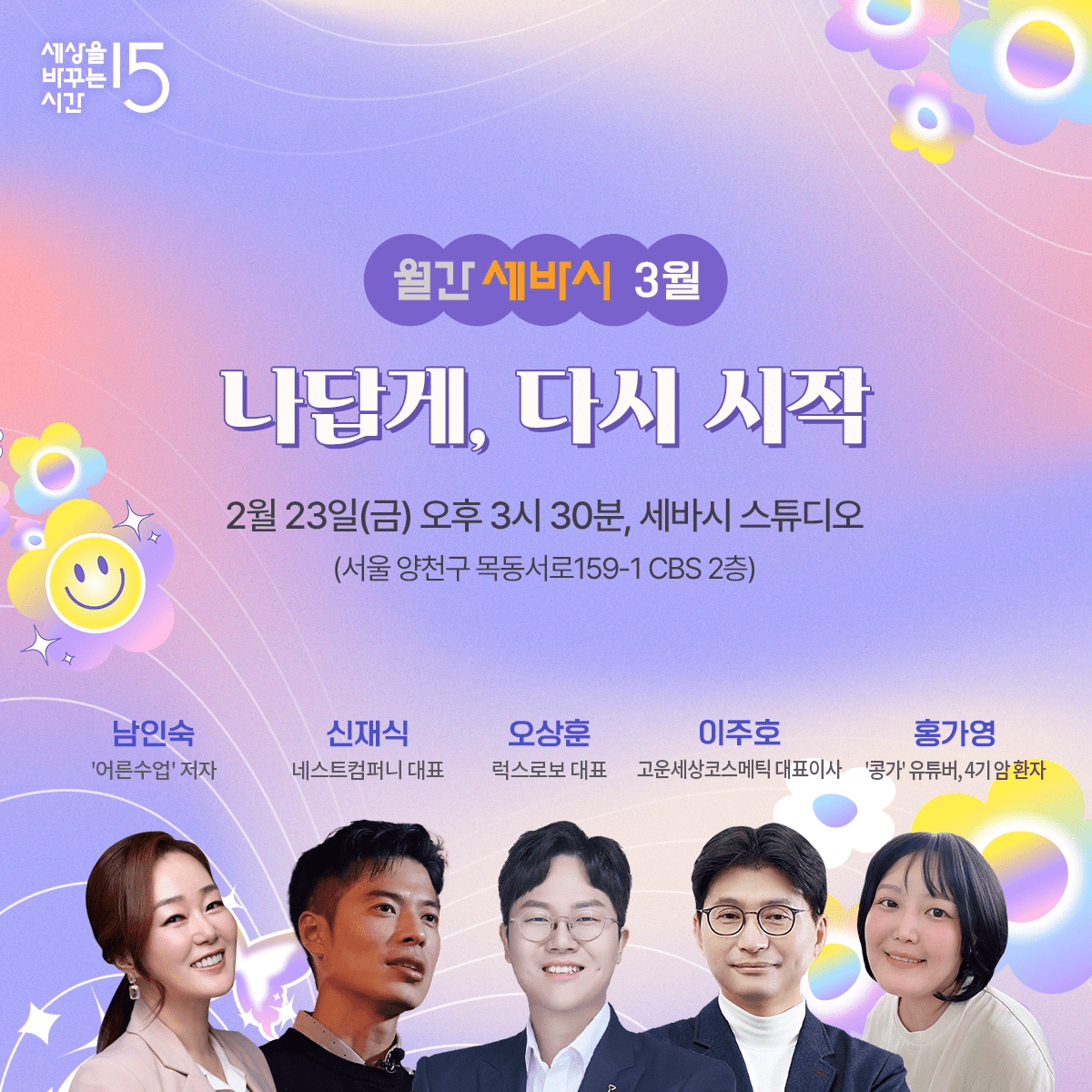 - 장소 : 서울시 양천구 목동서로 159-1 CBS 2층 세바시 스튜디오 (1층 인포데스크에서 안내를 받아주세요)