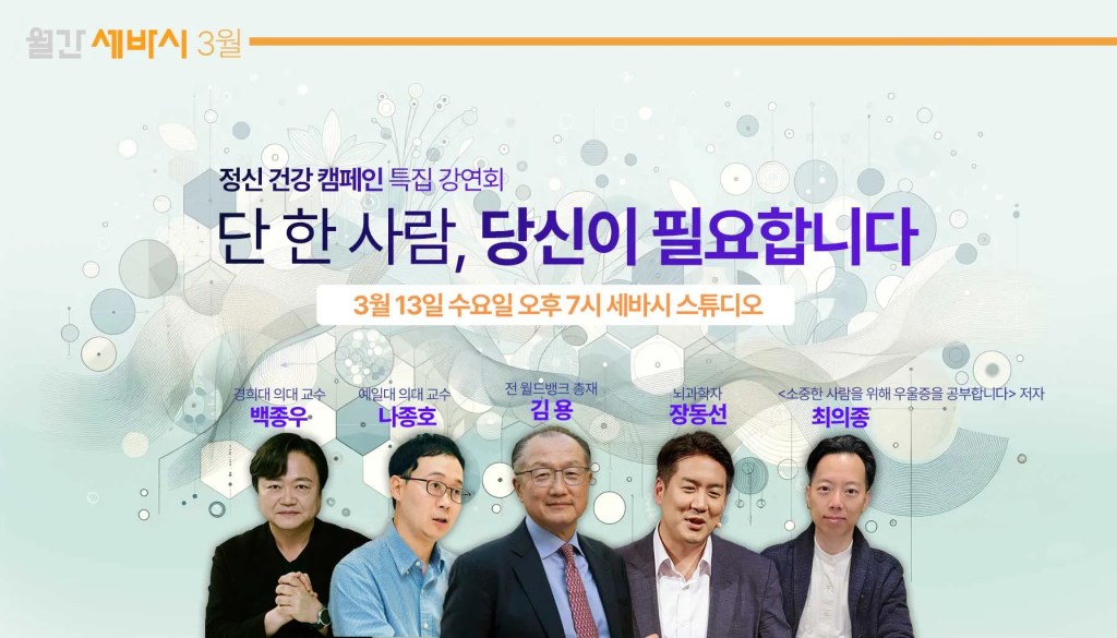 마음건강 문제는 세바시가 집중해 온 테마이기도 합니다.꼭 만나고 싶었던 마음건강 전문가들과 생생한 경험을 공개할 분들을 정성껏 모셨습니다.힘들수록, 우리 함께 모여요.마음을 데우는 봄 햇살이 더 많은 이들에 가 닿는 미래, 함께 꿈꾸어요.- 김용 전 월드뱅크 총재